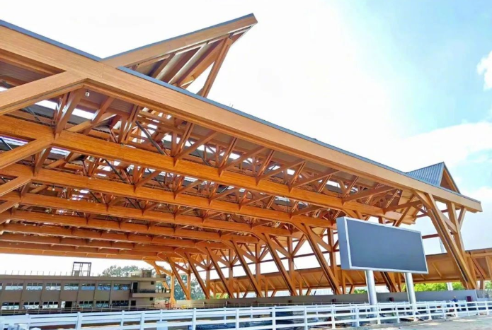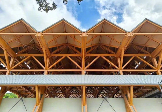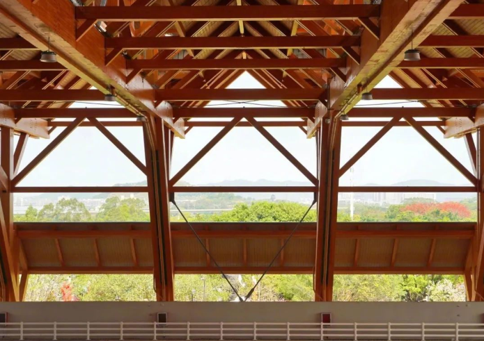 项目以“木构新境、众檐共景”为设计核心,从中国传统建筑“双坡屋顶”中汲取灵感,借助现代技术呈现出飞檐凌空的磅礴气势。建筑屋面采用跨度达66米的胶合木结构,单榀木梁最长96米、重37吨,由73000余个精密螺栓固定,刷新了国内体育建筑大跨度木结构的纪录。单独的屋顶单元相互搭接,形成蕴含结构逻辑的发散式密“檩”,现代结构之美跃然眼前。