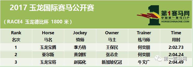 第四场是1800米,总奖金60万元的“玉龙德比杯”,出赛马匹有13匹,产地均为中国,马主王卫东旗下的“东兴小将”、王志刚的“青面兽”、于连杰的“旋风”、张志全的“亚尔斯”、邢兰凯的“风暴传奇”、唐炜的“爱的礼物”、高建鸥的“黑雨”、冯志国的“女儿红”、王保民的“玉龙宝腾”、骏星的“骏星97号”、孟祥伟的“玉龙神扬”和“玉龙神秘”、新加坡亿冠的“玉龙宝将”将在赛场展开激烈角逐。