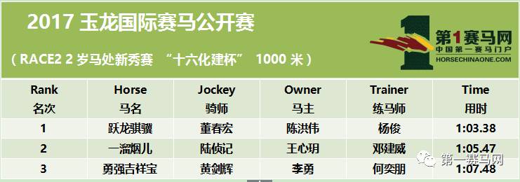 第二场比赛是“十六化建杯”2岁马新秀赛,途程1000米,奖金10万元。此战有8匹马出战。马主吉克隽逸旗下的“查尔瓦”、郭进旗下的“维京王子”、陈建国旗下的“樱桃小王子”、王心玥旗下的“一溜烟儿”、陈洪伟下的“跃龙骐骥”、新加坡亿冠的“摇滚节奏”和“玉龙宝格”、李勇旗下的“勇强吉祥宝”等将出赛。