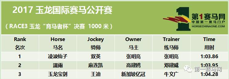 由于本场比赛共有14匹马满闸出赛,马匹亮相和入闸时间较之第二场也有些延迟。随着司闸长的一声号令,闸门打开后除了11号马“黑伯爵”因为跳起略微慢闸之外,所有马匹顺利出闸,率先拿到领跑位置的是14号马“东兴神剑”,但好景不长,在骑师双英的策骑下,13号马“凌波仙子”迅速超出,夺过领先优势,并且不断加速,迅速抛离其他对手,当进入弯道之时,它已领先其他马匹三个马位。转入最后直道,“凌波仙子”利用自己的领先优势,将内栏紧紧霸住并开始匀速向前。虽然此时镜头中只有它一匹赛马,但是在“凌波仙子”之后的6个马位之后,共有5匹赛驹正埋头勇进,其间暗流涌动,令人激动。随后一匹赛驹从中冲出,就是5号马“潇雨”,这匹来自北京京华兴俱乐部、 马主高建鸥名下的两岁马快速冲刺,不断拉近与13号马“凌波仙子”的距离,直至最后终点之时,才以半个身位的劣势憾败,拿下一席亚军。一直领跑的13号马“凌波仙子”如愿夺冠,2号马“玉龙宝剑”为东道主拿下一个第三。