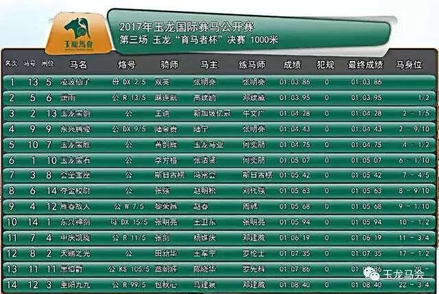 第一名 10月28日 “武汉临空港经开区杯”第十五届中国·武汉国际赛马节 9月2日 玉龙国际赛马公开赛第11个比赛日 第二名 第二名 8月12日 2017年第六届中国马术大赛 7月22日 2017年中国速度赛马大奖赛呼和浩特站 第三名 第三名 6月17日 2017武汉速度赛马公开赛“父亲节”主题赛马日