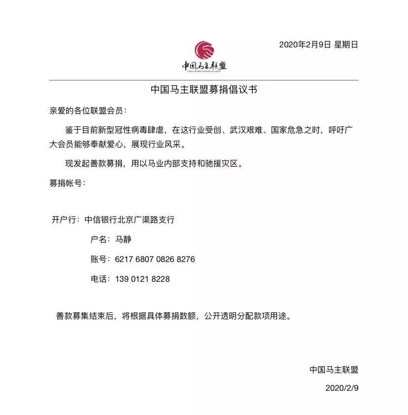 2月9日中国马主联盟发出募款倡议书,发起善款募捐,用以马业内部支持和驰援灾区。倡议书提到:鉴于目前新型冠状病毒肆虐,在这行业受创、武汉艰难、国家危急之时,呼吁广大会员能够奉献爱心,展行业风采。