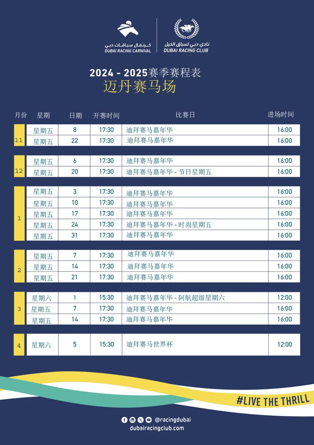 迪拜赛马嘉年华2024-2025赛季赛程表如下: