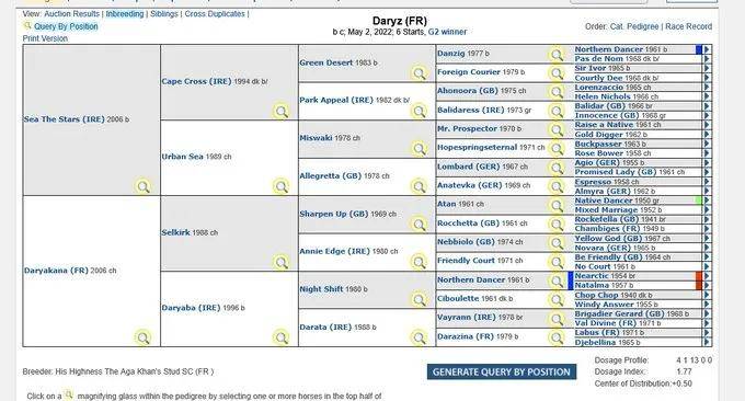 本场冠军“得令星”(DARYZ,法)出生于2022年,父系是著名种公马“海都之星”(Sea The Stars,爱),母系Daryakana(法)出自Selkirk。
