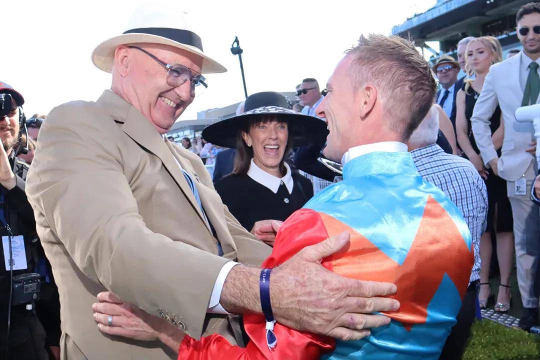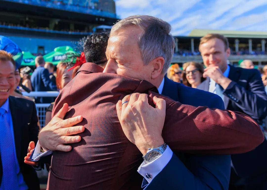 马主嘉应团体代表梁锡光(左)和香港赛马会行政总裁应家柏(右)赢赛后兴奋相拥