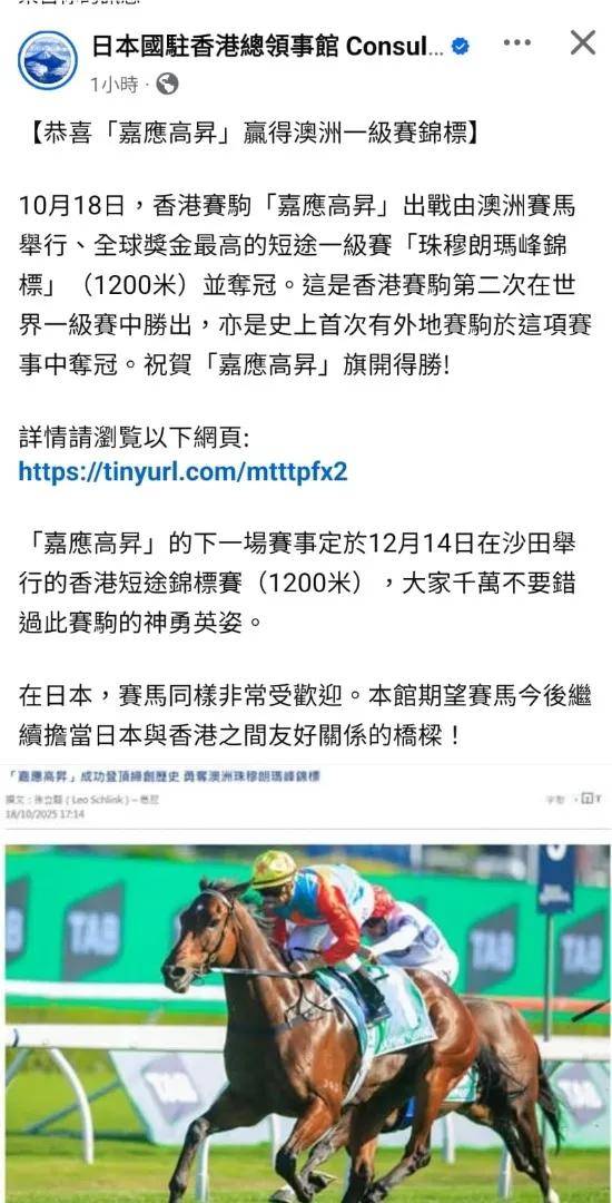 除了英国方面的邀请,今日日本国驻香港总领事馆也发文恭贺“嘉应高升”扬威澳洲。文中提到,赛马运动在日本同样广受欢迎,并希望赛马未来能继续担当日本与中国香港之间友好交流的桥梁。